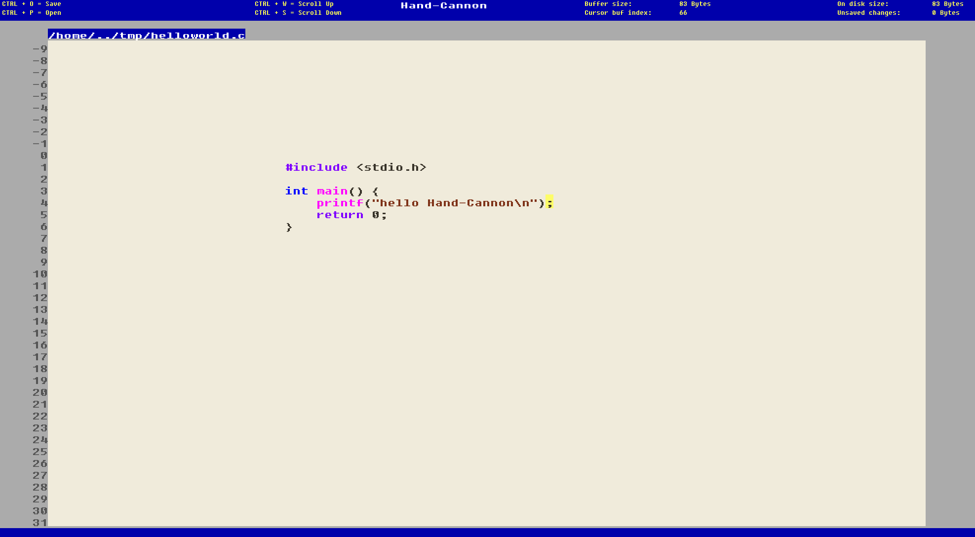 Hand Cannon was started because I was curious about how text editors handle editing large files. I researched different techniques like the piece table and gap buffer and tried to implement one, I chose the gap buffer because of the simplicity.